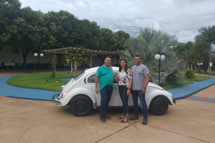 Alíssio Frassato, com o Delgado e Tiãozino, presidente do lar, durante a entrega do Fusca